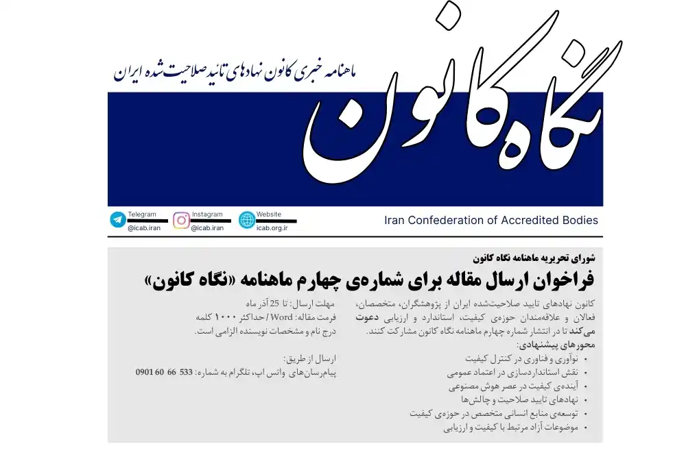 ماهنامه «نگاه کانون» از پژوهشگران، متخصصان، فعالان و علاقهمندان حوزههای کیفیت، استاندارد و ارزیابی انطباق دعوت میکند تا با ارسال مقالات علمی و تخصصی، در انتشار شماره چهارم این نشریه مشارکت کنند.